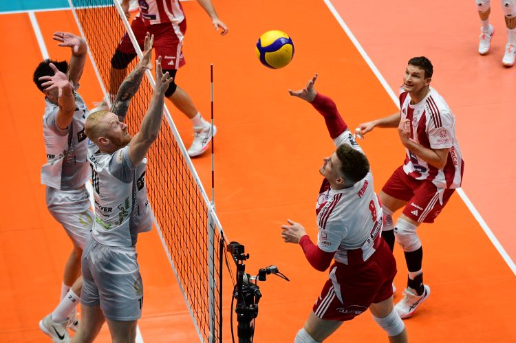 Οι Ερυθρόλευκοι προηγήθηκαν με +3 στο πρώτο σετ (8-5) με Πέριν και Τζούριτς, αλλά ο Πολουγιάν ανέβασε την απόδοσή του για τον Μίλωνα που ισοφάρισε και μετά το 13-13 βρέθηκε στο 13-15 και έφτασε ως και το 17-21 μετά την άστοχη επίθεση του Πέριν. Ωστόσο, ο Καναδός δημιούργησε σερί με τα σερβίς του και το 19-22 έγινε 23-22 με επίθεση του Ζουπάνη.