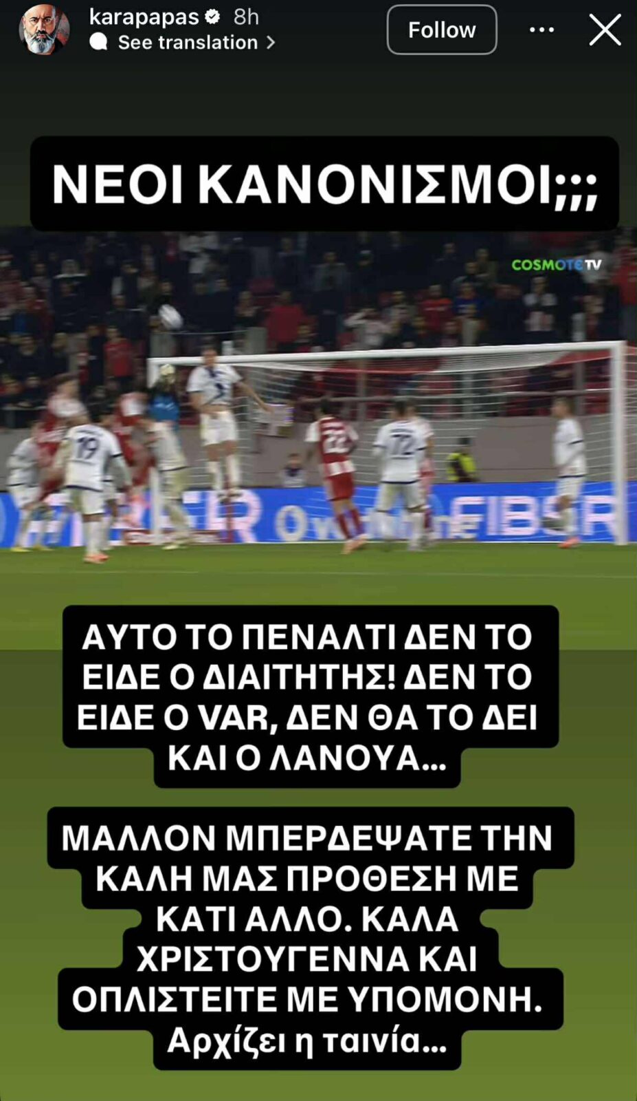 Ο Κώστας Καραπαπάς έκανε ανάρτηση για αυτή τη φάση και αναρωτιέται αν υπάρχουν νέοι κανονισμοί για ένα πέναλτι που δεν είδαν διαιτητής, VAR και δεν θα το δει και ο επικεφαλής της ΚΕΔ, Στεφάν Λανουά.