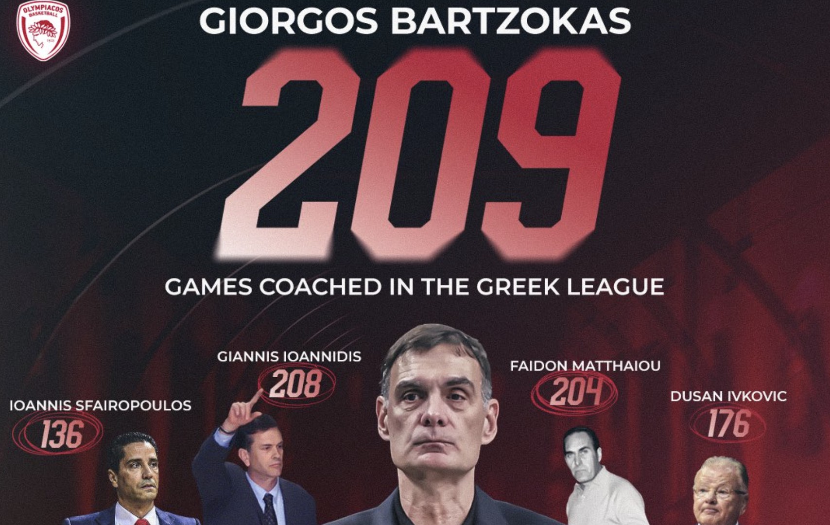 Πιο συγκεκριμένα, ο προπονητής του Ολυμπιακού έφτασε τους 209 αγώνες στον ερυθρόλευκο πάγκο στην GBL και έμεινε μόνος πρώτος στη σχετική λίστα αφού ξεπέρασε τον Γιάννη Ιωαννίδη (208 αγώνες). Παρακάτω στη λίστα βρίσκονται οι Φαίδωνας Ματθαίου (204 αγώνες), Ντούσαν Ίβκοβιτς (176) και Γιάννης Σφαιρόπουλος (136).