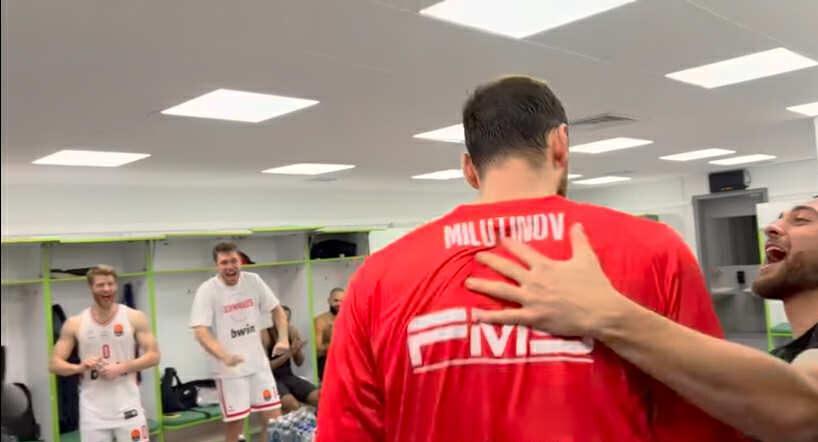 Οι παίκτες της ομάδας χάρηκαν αυτή τη μεγάλη νίκη, με τον Νίκολα Μιλουτίνοφ να γνωρίζει την αποθέωση στα αποδυτήρια του ΟΑΚΑ και όλους να φωνάζουν «Ολυμπιακός» όντας μία γροθιά, όπως φαίνεται στα αποκλειστικά πλάνα που δημοσίευσε η ΚΑΕ Ολυμπιακός.