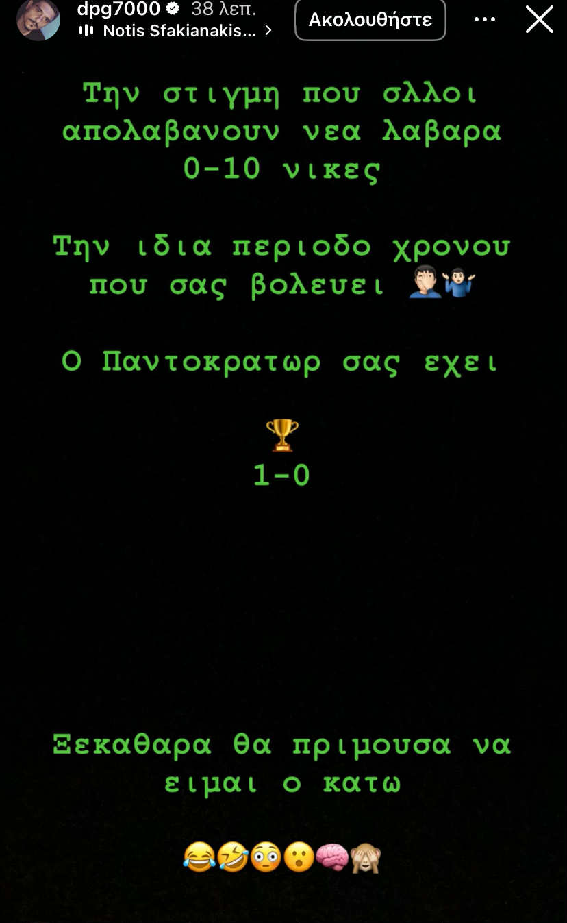 Ο Ολυμπιακός πανηγύρισε την 10η σερί του νίκη σε επίπεδο Ευρωλίγκας κόντρα στον Παναθηναϊκό και ο ισχυρός άνδρας της πράσινης ΚΑΕ, αφού πρώτα αντέδρασε στις δηλώσεις Αταμάν αλλά και σε συγκεκριμένη ατάκα του Γιώργου Αγγελόπουλου, επανήλθε μέσω instagram story κάνοντας λόγο για… παντοκράτορα Παναθηναϊκό.