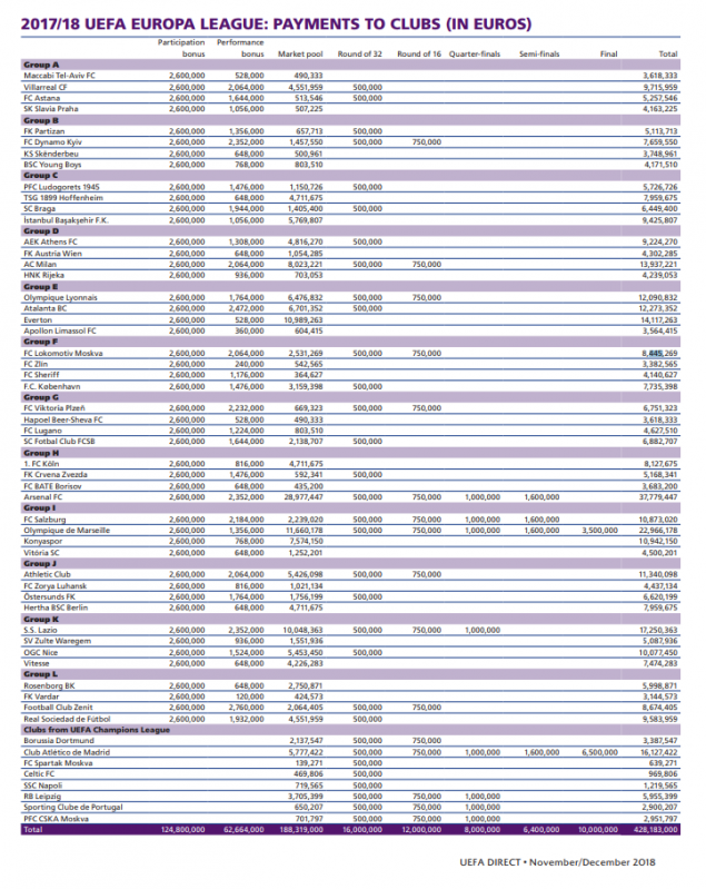 Σύμφωνα λοιπόν με τα απτά στοιχεία της διοργανώτριας αρχής, η Ένωση «έβγαλε» από την πορεία της μέχρι τους «32» του Europa League 9.224.270 ευρώ. Συγκεκριμένα, 2.600.000 από την είσοδο στους ομίλους της διοργάνωσης, 1.308.000 από τους βαθμούς που πήρε στον όμιλο, 4.816.270 από το market pool που κατέληξε ολόκληρο στα ταμεία της μετά τον αποκλεισμό του ΠΑΟΚ από την Έστερσουντ και 500.000 από τη συμμετοχή στους «32».