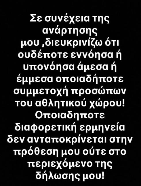 «Σε συνέχεια της ανάρτησης μου, διευκρινίζω ότι ουδέποτε εννόησα ή υπονόησα άμεσα ή έμμεσα οποιαδήποτε συμμετοχή προσώπων του αθλητικού χώρου! Οποιαδήποτε διαφορετική ερμηνεία δεν ανταποκρίνεται στην πρόθεσή μου ούτε στο περιεχόμενο της δήλωσής μου!», έγραψε χαρακτηριστικά.