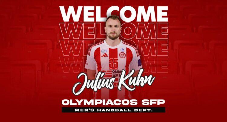 «Ο ΟΛΥΜΠΙΑΚΟΣ Σ.Φ.Π. ανακοινώνει την έναρξη της συνεργασίας του με τον Γιούλιους Κιουν. Ο διεθνής Γερμανός αριστερός ίντερ (1/4/1993, 1,98μ.) υπέγραψε το νέο του συμβόλαιο και εντάσσεται στο ρόστερ της ομάδας χάντμπολ του συλλόγου.