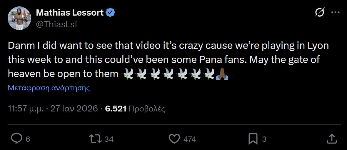 Ο Ματίας Λεσόρ εμφανίστηκε σοκαρισμένος από τον αδόκητο χαμό επτά φίλων του ΠΑΟΚ που ταξίδευαν στη Λιόν για την αναμέτρηση της ομάδας τους. Ο σέντερ του Παναθηναϊκού επηρεάστηκε καθώς όπως ανέφερε στην ανάρτησή του, θα μπορούσαν να είναι φίλοι της δικής του ομάδας αφού και αυτή παίζει με τη Βιλερμπάν στη Λιόν την Παρασκευή.