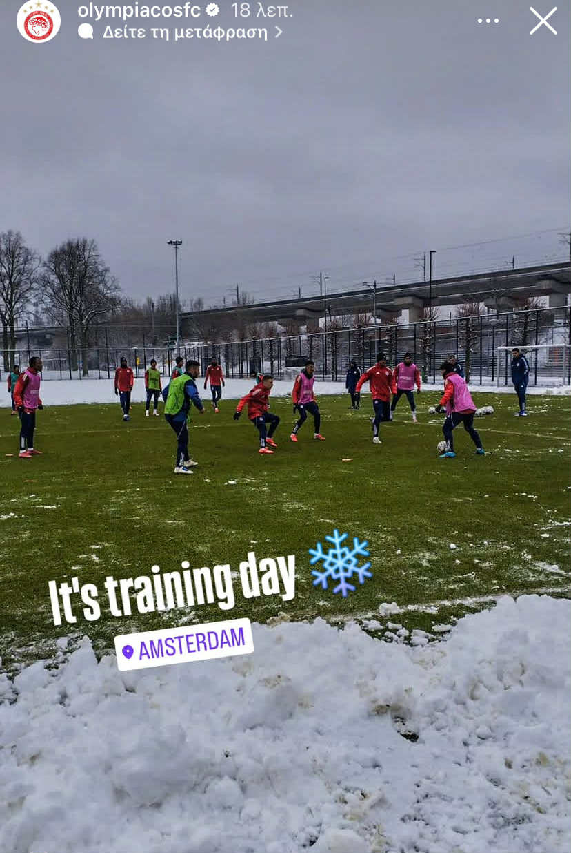 Λίγες ώρες μετά τη μεγαλειώδη επιτυχία του επί του Άγιαξ ο Ολυμπιακός προπονήθηκε στο Άμστερνταμ και μάλιστα σε λευκό τοπίο αφού ο καιρός στην ολλανδική πρωτεύουσα επεφύλασσε χιόνια και τσουχτερό κρύο.