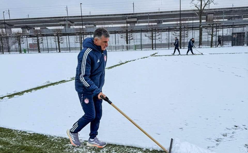 Την παράσταση έκλεψε ο Χοσέ Λουίς Μεντιλίμπαρ που πήρε το φτυάρι και βοήθησε να καθαριστεί το γήπεδο ώστε οι Ερυθρόλευκοι να κάνουν στην ώρα τους κι όπως πρέπει την προπόνηση ενόψει του ντέρμπι με την ΑΕΚ (1/2, 21:00) στη Νέα Φιλαδέλφεια.