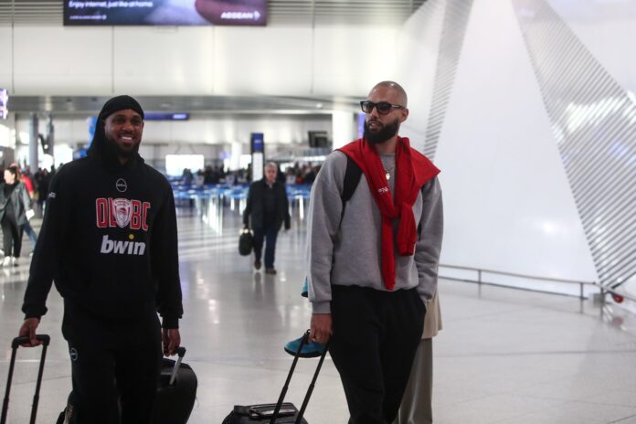Χαμογελαστοί οι παίκτες των Πειραιωτών μπήκαν στο αεροπλάνο με προορισμό την πόλη της Κρήτης, με στόχο να κατακτήσουν τον δεύτερο τίτλο της φετινής σεζόν, μετά από αυτόν του Σούπερ Καπ.