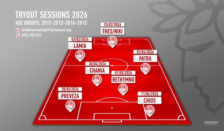 Μετά από τα δοκιμαστικά τα οποία πραγματοποιήθηκαν από την Ακαδημία του Ολυμπιακού σε ποδοσφαιριστές των «ερυθρόλευκων» Σχολών ποδοσφαίρου σε Αττική και Περιφέρεια, θα έχουν την ευκαιρία να δοκιμαστούν και νεαροί ποδοσφαιριστές απ’ όλη την Ελλάδα από τις 25 Φεβρουαρίου έως και τις 11 Ιουνίου.