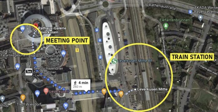 Το σημείο συνάντησης για τους φιλάθλους μας είναι η πλατεία “Friedrich-Ebert-Platz, Leverkusen”. Από το σημείο συνάντησης θα μπορούν οι φίλαθλοί μας να μεταβούν στο γήπεδο είτε με το τρένο από τον σιδηροδρομικό σταθμό “Wiesdorf Leverkusen Mitte Bf”, είτε με τα πόδια (20 λεπτά).