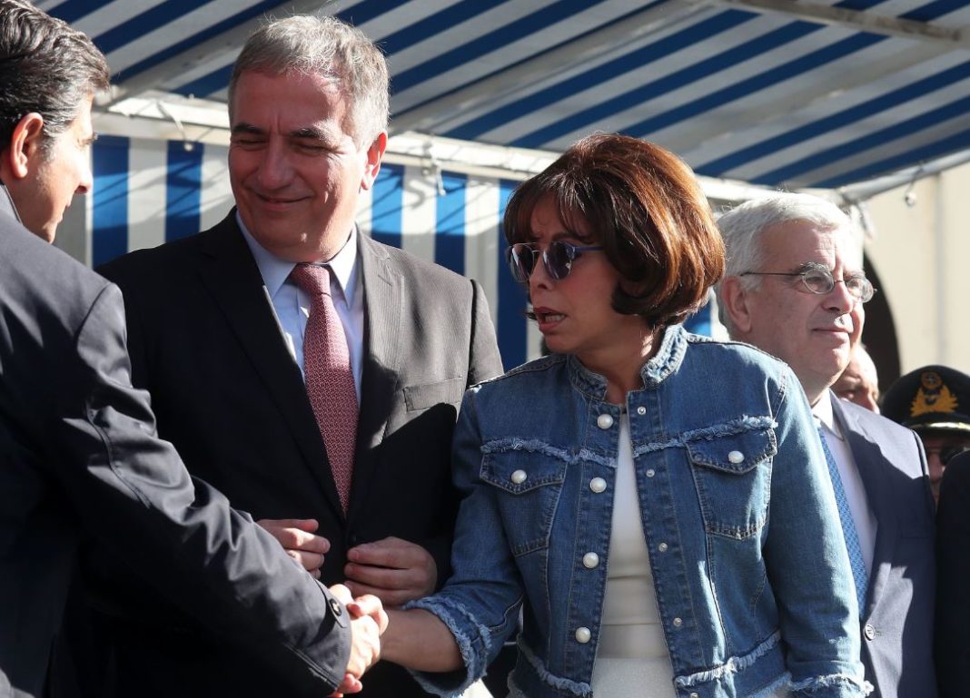 Πολύ πιο συντηρητική η υφυπουργός Μακεδονίας-Θράκης Κατερίνα Νοτοπούλου, φόρεσε υφασμάτινο cropped παντελόνι, μαύρο blazer, nude μπλούζα με μαύρο γιακά, μαύρο τσαντάκι με αλυσίδα στον ώμο και nude σουέντ flat παπούτσια, ενώ είχε τα μαλλιά της αραιές μπούκλες με πιασμένες τις μπροστά τούφες πίσω.