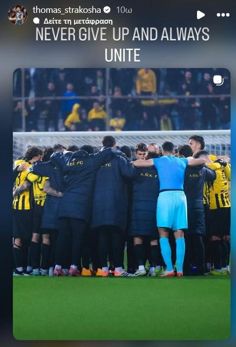 Παρά την ισοπαλία, ο τερματοφύλακας της ΑΕΚ, Θωμάς Στρακόσα, έστειλε μήνυμα ενότητας, αναφέροντας: «Δεν τα παρατάμε ποτέ. Πάντα ενωμένοι».