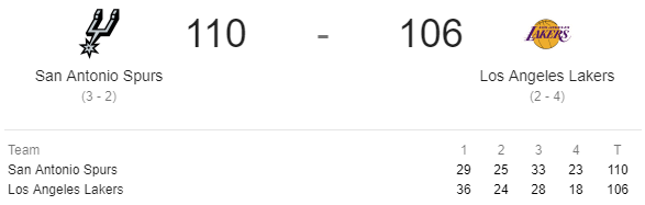 Από την άλλη, τα μαύρα σύννεφα παρέμειναν πάνω από την ομάδα του Λεμπρόν, η οποία γνώρισε για ακόμη μία φορά την ήττα από τους Σπερς. Σε μία ιστορική γι’ αυτόν βραδιά, ο Τζέιμς σκόραρε 35 πόντους, περνώντας, έτσι, τον Ντερκ Νοβίτσκι στη λίστα με τους κορυφαίους σκόρερ όλων των εποχών για την έκτη θέση, έχοντας 31.188 πόντους σε όλη του την εώς τώρα καριέρα. Τα 11 ριμπάουντ και οι 4 ασίστ που συνόδευσαν τους 35 πόντους δεν ήταν αρκετά για να οδηγήσουν την ομάδα του στη νίκη, με αποτέλεσμα οι Λέικερς να χάσουν με σκορ 106-110, σε ένα ματς όπου, καθόλη τη διάρκειά του, δεν υπήρξαν μεγάλες διαφορές, όπως φαίνεται και στον παρακάτω πίνακα.