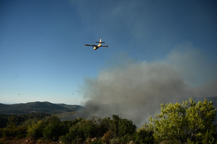 Η φωτιά καίει σε ένα σημείο με δύσβατο ανάγλυφο, γεγονός που καθιστά το έργο της Πυροσβεστικής δύσκολο.