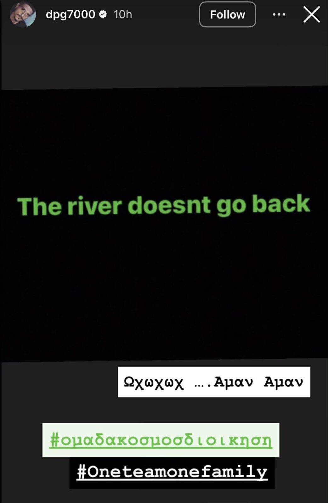 «Το ποτάμι δεν γυρίζει πίσω», έγραψε σε story αμέσως μετά τη νίκη απέναντι στη Μονακό και πρόσθεσε: «Ωχ ωχ ωχ. Αμάν Αμάν. Ομάδα, κόσμος, διοίκηση. Μια ομάδα μια οικογένεια».