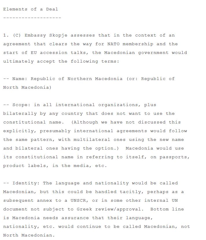 Δέκα ολόκληρα χρόνια προσπαθούσαν τα Σκόπια να αποσπάσουν το όνομα Βόρεια Μακεδονία αλλά και να φτάσουν σε μια συμφωνία που θα τους έδινε μακεδονική γλώσσα και ταυτότητα όπως αποκαλύπτει έγγραφο-«φωτιά» που έφεραν στη δημοσιότητα τα Wikileaks.